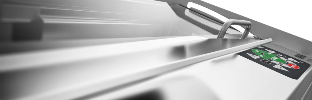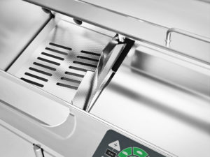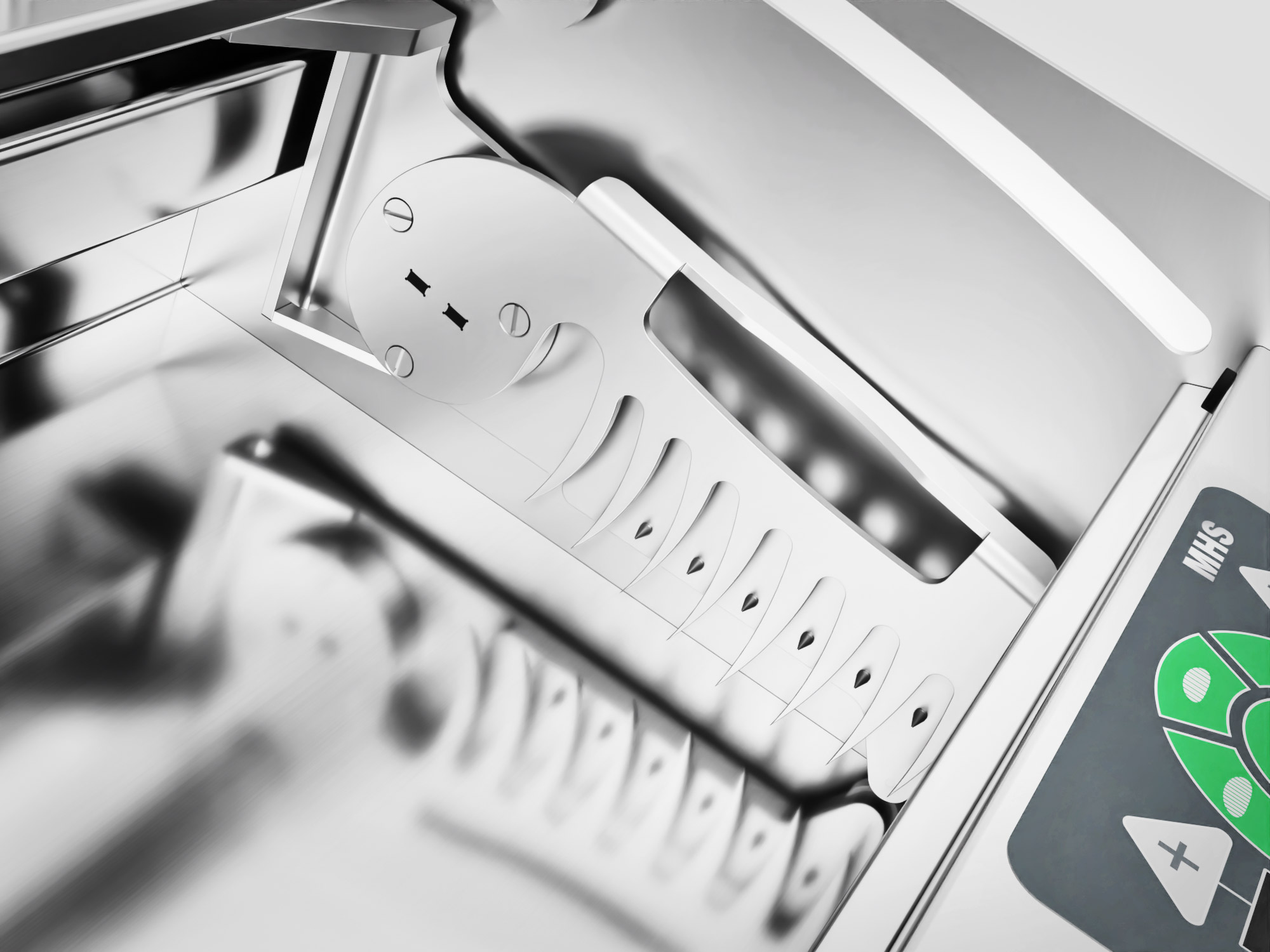 Die stabile Entnahmewanne mit Krümelschlitzen ist zur Reinigung nach vorne klappbar sowie werkzeuglos entnehmbar und erleichtert so den Zugang zum Schneidraum.